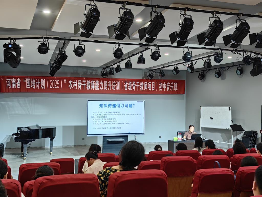 9月15日,应我院邀请,河南省高层次人才,中原千人计划(育才系列)—领军人才,中原教学名师郑小艳教授为 河南省“国培计划(2025)”农村骨干教师能力提升培训项目初中音乐省级骨干教师班学员讲授《从文本到人本:从音乐教材到音乐教学》,郑小艳教授围绕新课程改革核心要点,为学员深度剖析课程变革内核,提供了兼具理论高度与实践指导的教学新思路。