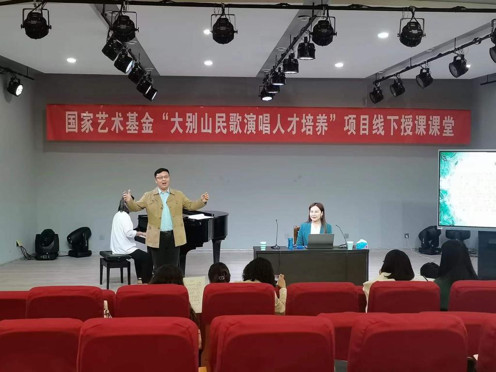3月14日上午,国家艺术基金“大别山民歌演唱人才培养”线下授课课堂在我校WilliamHILL中国一楼八音讲堂如期进行。大别山民歌传承人,信阳市民歌研究会副主席李鸣凤应我校邀请,以《豫南田歌》为题进行线下教学。