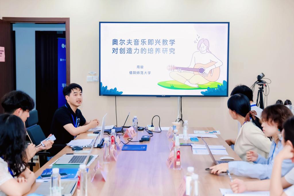为促进跨学科、跨领域的交流与合作,打破传统创新模式局限,完善人才培养机制,全面提升国家自主创新能力。2025年6月13日至15日第十一届全国创造力学术研讨会于华东师范大学普陀校区顺利举办。本次会议由中国创造力研究协作组、华东师范大学心理与认知科学学院、上海市心理学会、上海市心理健康与危机干预重点实验室主办。会议以“数智时代的自主创新与人才自主培养”为主题,汇聚顶尖智慧,重点聚焦新兴技术对自主创新和人才培养的影响和数智时代教育模式革新等核心议题,旨在通过高水平的学术交流与思想碰撞,为教育强国建设和中华民族伟大复兴提供坚实的人才支撑。我院理论教研室主任周骏副教授携研究生张文山应邀参加本次会议,并在会议论坛做《奥尔夫音乐即兴教学对创造力的培养研究》主题发言。