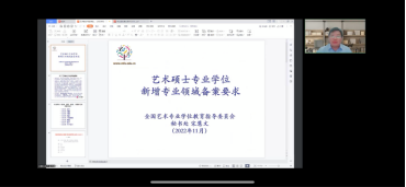 宋慧文秘书长首先就如何开展艺术硕士的招生和培养工作展开交流,对艺术硕士专业学位教育的基本特征进行了解读。并详细介绍了我国硕士生培养的发展变化,根据最新版《指导性培养方案》,重点解读了艺术硕士专业学位培养目标、课程设置、毕业考核、要求论文等关键问题。同时指出了艺术硕士专业学位人才培养的目标导向,以强化专业性实践能力为主,兼顾理论学习与综合素养提升的培养要求。随后,宋秘书长依据教育部2020年新修订的《学位授权申请基本条件》从专业特色、师资队伍、人才培养、培养环境与条件几个方面进行了详细分析解读。