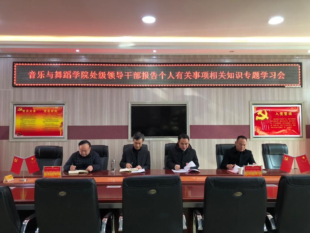12月25日,我院在艺术楼“党员之家”会议室召开处级领导干部报告个人有关事项相关知识专题学习会。学院全体处级领导干部参加会议,会议由党委书记武治国主持。