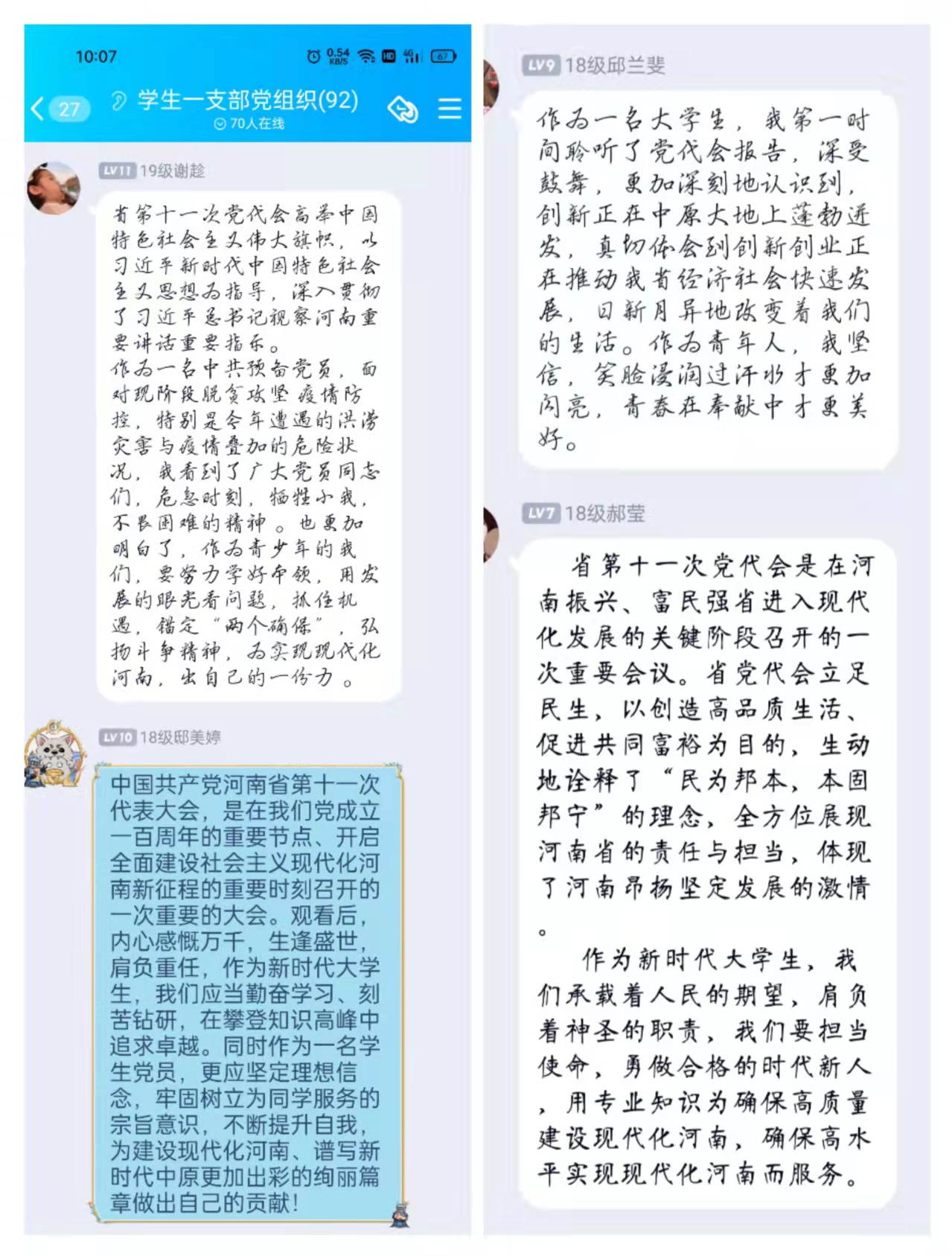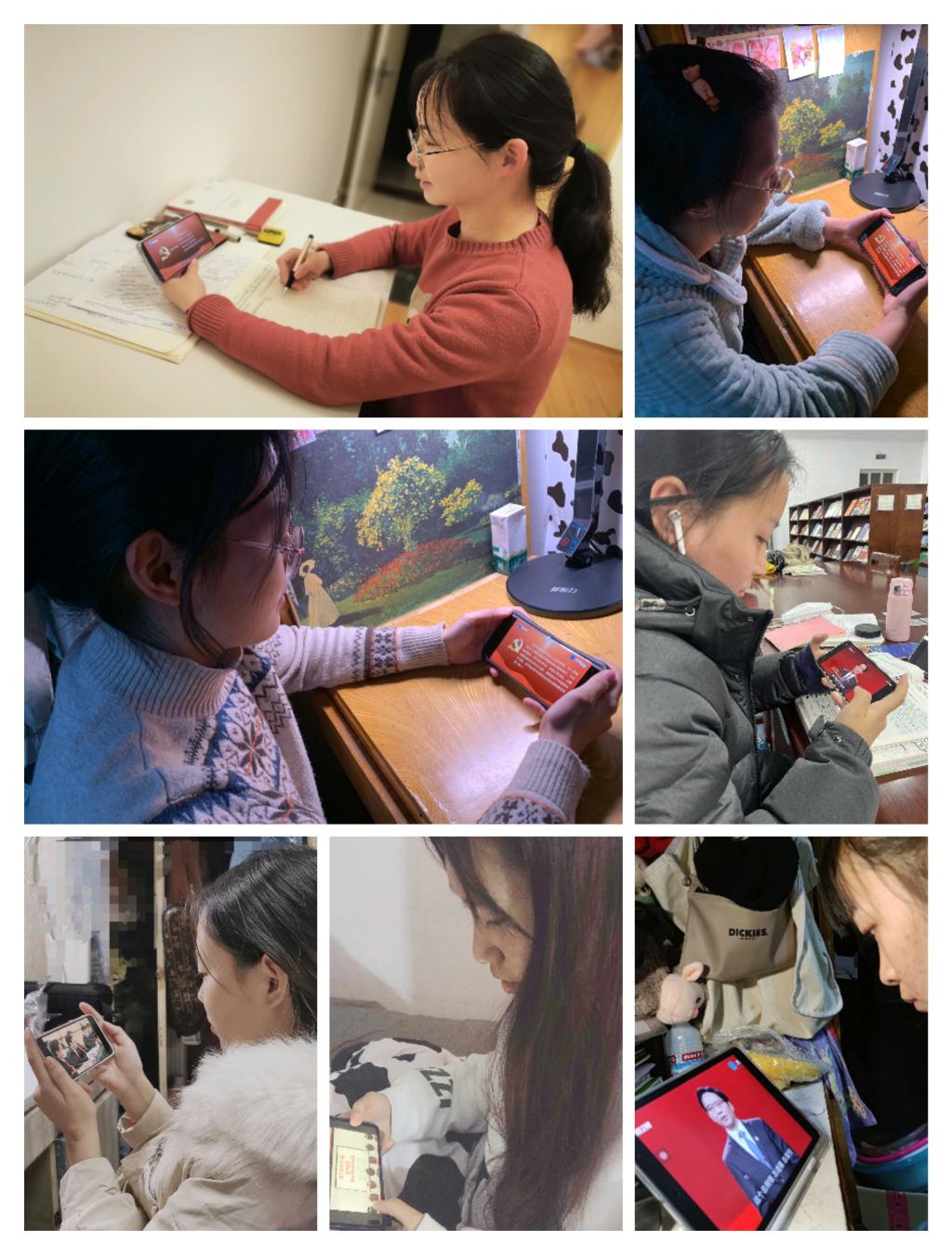 党员同志们通过手机、电视、电脑等媒体在家、在宿舍认真观看了宣讲视频,同时在党员交流群中分享学习的心得体会。