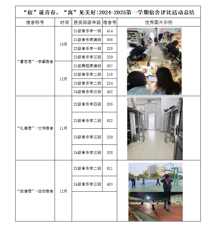 为营造温馨、和谐、文明的宿舍氛围,提高同学们的生活品质,培养良好的生活习惯和团队协作精神,我院举办了宿舍评比活动,从宿舍卫生与美化、宿舍文化建设以及宿舍成员身体健康三个方面加强宿舍建设,评比结果如下: