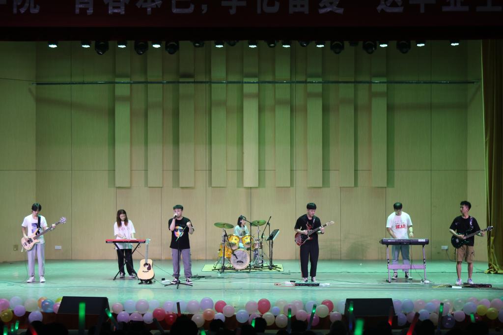 晚会在新蜜蜂乐队带来的《我们的时代》中火辣开场,架子鼓和电吉他迸发出的旋律营造了动感热辣的现场氛围。“新蜜蜂”乐队先后为观众送上了《白日梦蓝》、《无人的海边》、《嘿,姑娘》等歌曲,洒脱欢快的曲风唱出了年轻人的生活态度,展现出青年一代对生活的热爱和向往,积极向上的氛围激发观众挥动荧光棒加入夏日聚会;歌曲《霓虹甜心》复古的disco风格瞬间把全场带回八十年代,为观众展现了欢快的夏日时光;在大家的热烈欢呼下《平凡之路》出场,熟悉的旋律,励志的歌词,使得全场观众都不禁跟着唱起来。演出者们全身心投入,表演赢得掌声不断。晚会中还穿插了微信上墙和抽奖等环节,观众们积极参与,热情满满。最后观众们听到乐队带来的《你要跳舞吗》都不由自主的随着鼓点节拍翩然舞动,把全场气氛推向最终的高潮,也为本次晚会画下了圆满的句号。