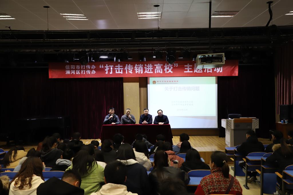 信阳市监督管理局打击传销办公室王主任从传销的本质、表现形式、危害性,如何防范传销等内容开展打击预防传销专题讲座。报告会后,活动还通过并设立打击传销行为咨询处,悬挂横幅、摆放展板、发放资料、现场咨询等多种宣传形式,向学生全方位、多角度揭示传销的本质。