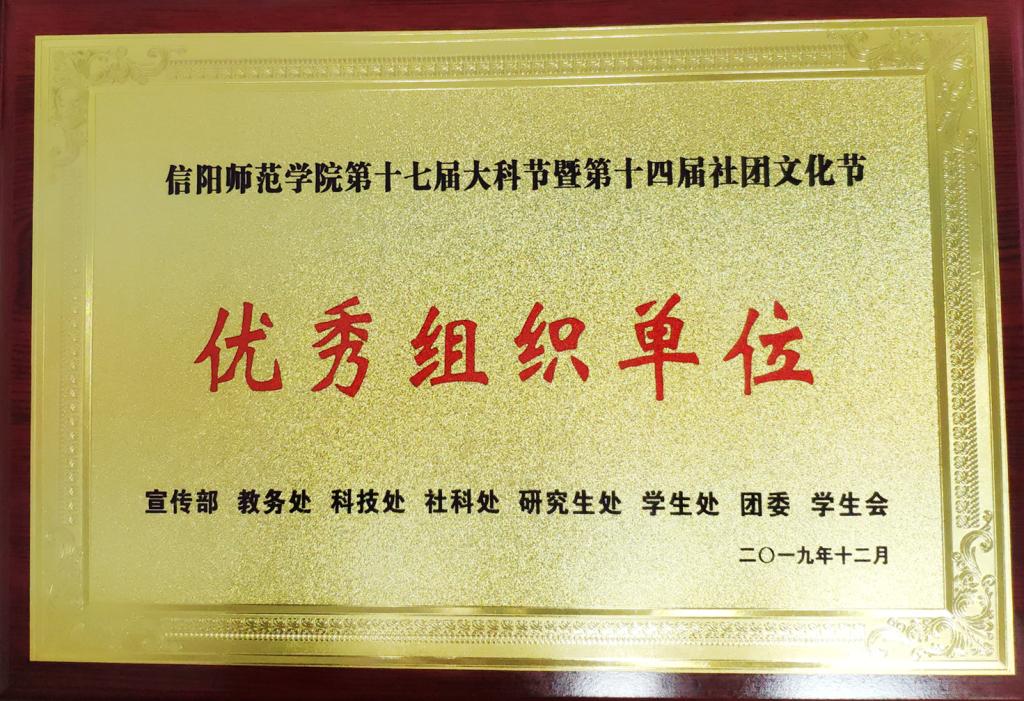 12月30日,我校第十七届大学生科技文化艺术节暨第十四届社团文化节颁奖典礼暨2020年新年晚会在理科楼报告厅举办。校党委副书记郜火星、副校长余本海应邀出席,各相关职能部门负责同志、各社团指导教师与五百余名师生一起参加了颁奖仪式。我院社团工作因组织得力、效果显著,荣获第十七届大学生科技文化艺术节暨第十四届社团文化节“优秀组织单位”。