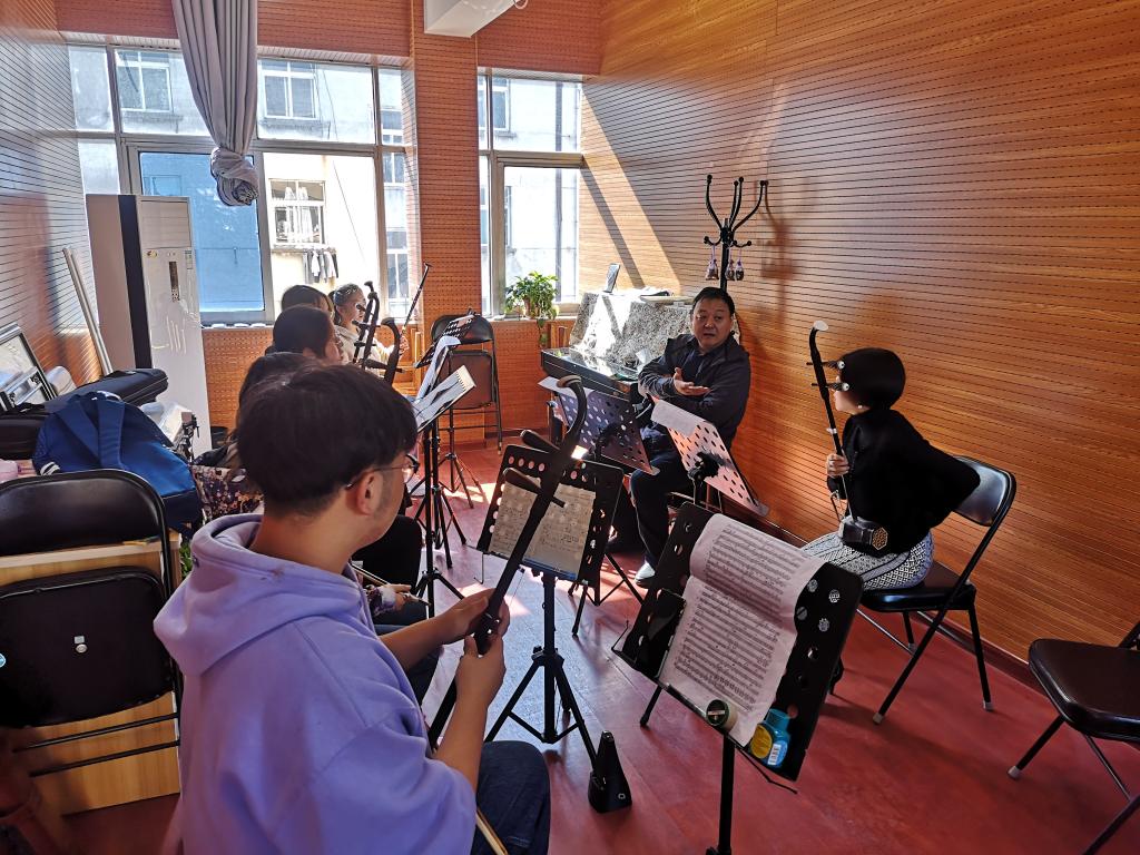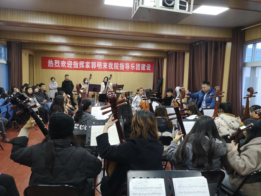 7号上午针对《走西口》、《长白欢歌》和《对情歌》等曲目进行了重点排练;下午着重排练了《小夜曲》、《大风起兮云飞扬》和《美好的期待》等作品。排练过程中郭明老师不失时间的点拨,及其投入的指挥让团员们更加深刻的理解了演奏技巧的应用以及乐曲情感的表达。河南省民族乐团的几位首席老师也和同学们一起参与到了排练当中,为乐队把脉指津。8号上午,重点排练了古筝二重奏《晓雾》、钢琴四手联弹《春节序曲》、二胡齐奏《过年》等作品;下午重点对二胡齐奏《过年》的快板进行了指导。排练期间,学院的领导老师也亲临排练现场,并给予同学们亲切的关怀和鼓励。此次排练使得同学们增强了专业自信,受益匪浅。