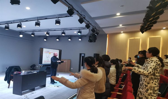 1月10日, 河南大学艺术学院教授、硕士生导师陈家海应邀来到WilliamHILL中国,在艺术楼八音讲堂为2020年河南省骨干教师培育项目-小学音乐培训班的全体学员讲授合唱指挥公开课,我院副院长陈新宇主持。