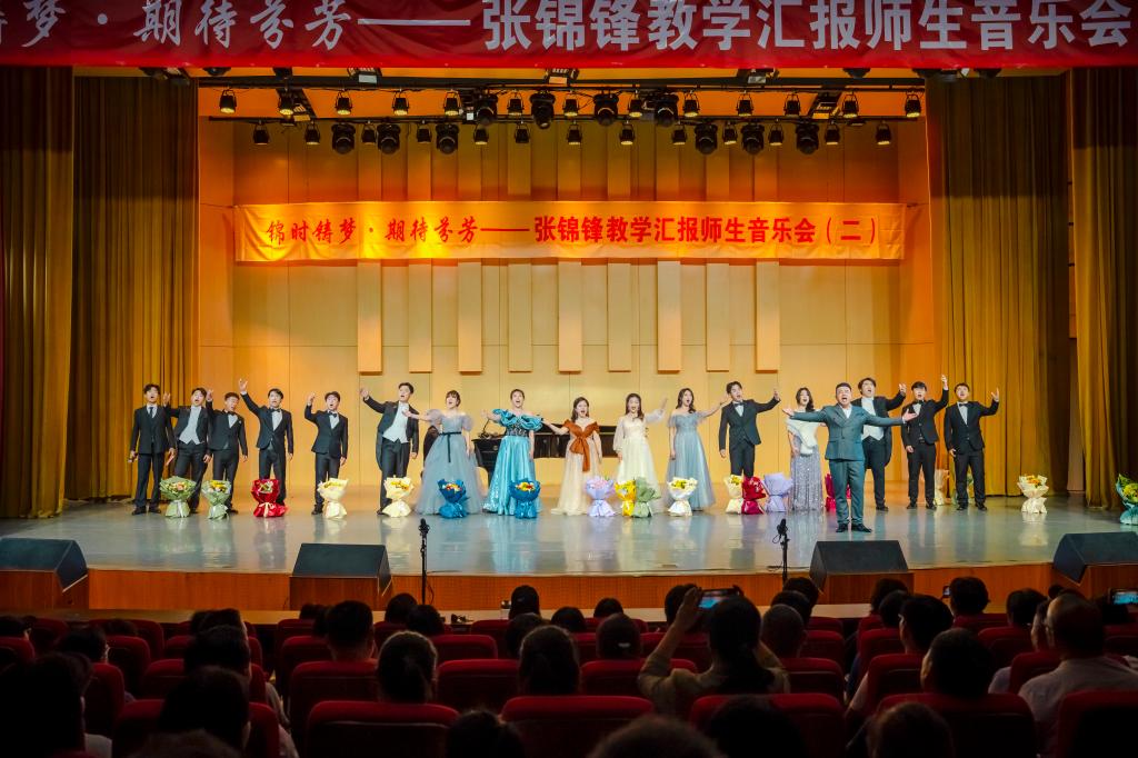 本次音乐会历时一个半小时,形式丰富,内容多样。开场一首合唱《大豆白米花生》拉开音乐会的帷幕,独唱《两地曲》《七步诗》《我爱这土地》《你们可知道》《人就活一回》等歌曲诠释了多种风格的精彩音乐作品,学生们充分展示了专业素养和精神风采;二重唱《紫藤花》《一半》引人入胜,为舞台增添了更多的创造性色彩;由张锦锋老师带来的《月下独酌》无疑成为本场的高潮。最后,音乐会随着全体师生共同演唱《饮酒歌》的欢快歌声中圆满落幕,丰富而有创意的节目形式为观众们上演了一场精彩的视听盛宴。