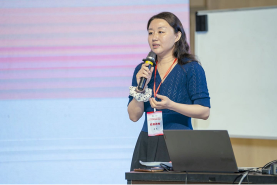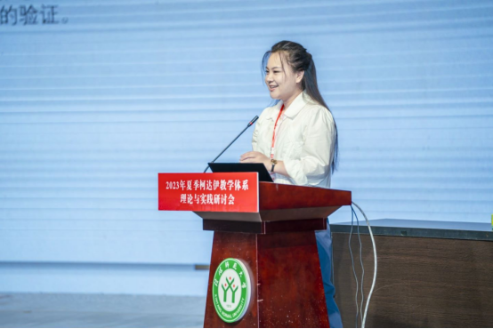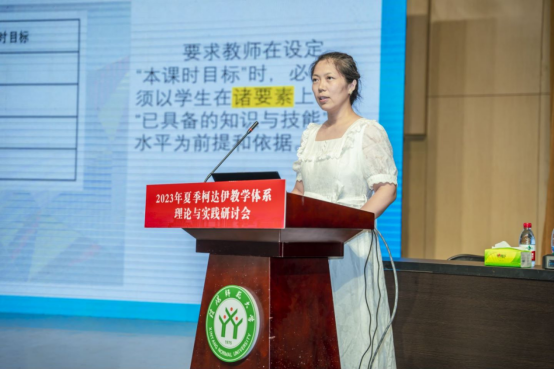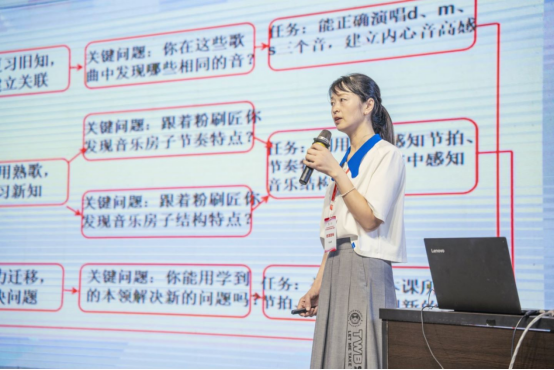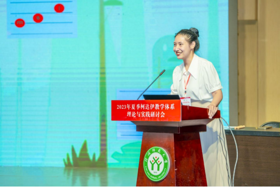 接下来,樊荣用论文宣读的形式,通过梳理新课标和人音版教材对小学低学段1-2年级学生的音乐能力要求,详细说明在《火车开啦》这堂课中柯达伊教学法的具体应用。主要论述在课程的节奏教学与巩固提高环节,教师如何用柯达伊教学法培养学生的节奏能力、稳定拍感能力和内心听觉能力。